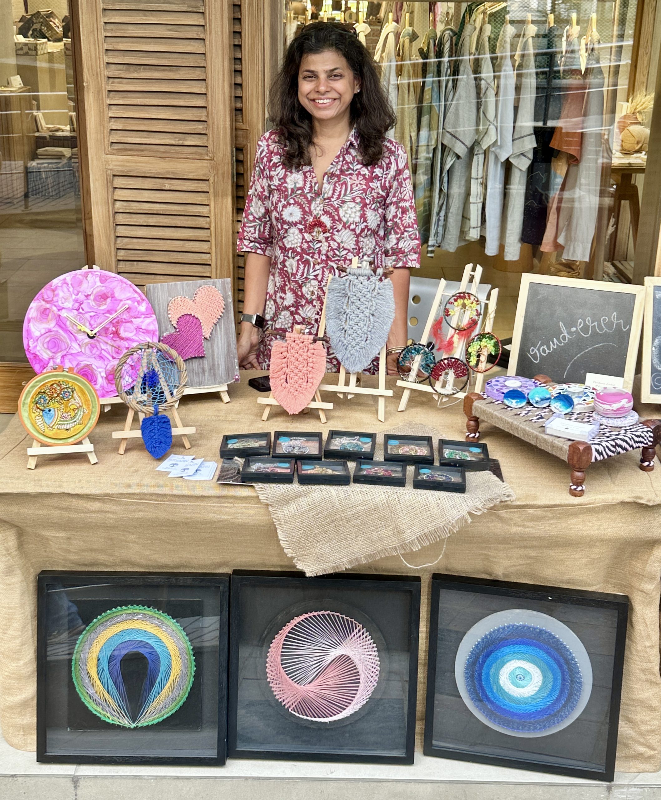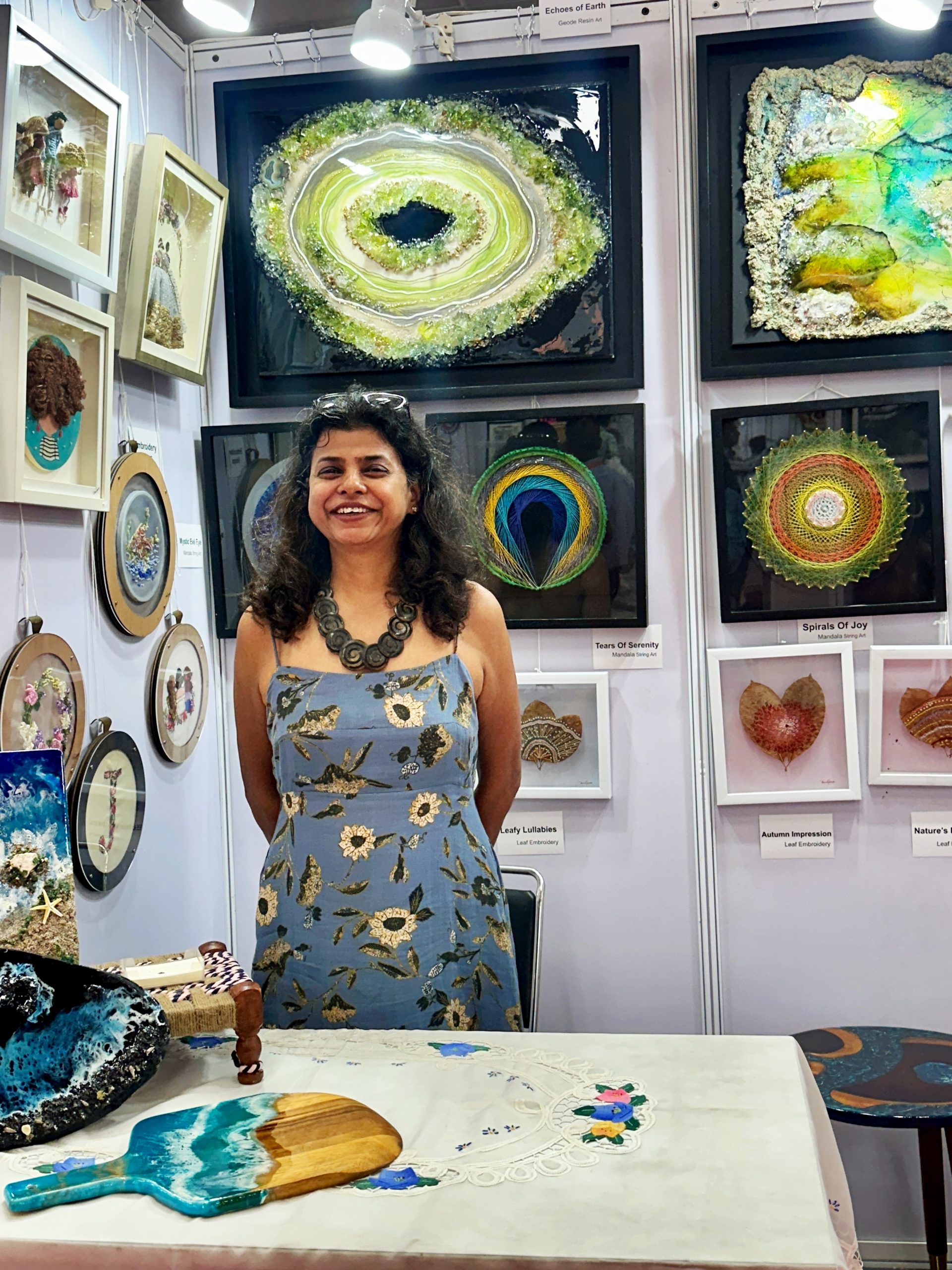 Today, my studio is a mix of embroidery thread, macramé cords, string art, and resin. I’m especially drawn to the things we usually walk past, like dried leaves, reclaimed wood, and weathered pebbles. To me, this work is about weaving threads – between people, places, and the moments we want to hold onto.